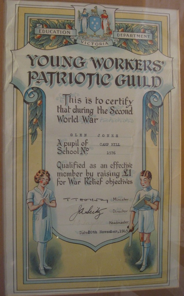 We even built our own air-raid shelter in the back yard. It was about 2 metres deep with a corrugated iron roof covered with dirt. It was a good cubby house! Events of the war were discussed with great earnestness and I recall Mr Fulton leaning over the back fence to solemnly tell Dad that the “Hood” had been sunk. The son of one of our neighbours, the Hopkins, had been seriously injured in a mishap in England when he walked into a whirling propeller. He recovered only to be killed later as a rear gunner in a Lancaster over Germany. Another neighbour, Norm Gallagher , was taken prisoner of war by the Japanese. At school we contributed two shillings a week towards War Savings Bonds. When you reached five pounds you were given a certificate. There was a very exciting occasion when a DC3 crash landed out at Welsford (just south of Bendigo) and the pilot was killed when the plane hit a tree at the end of the emergency runway. Dad dinked me out to see the wreckage. On another occasion I climbed over the fence of the Showgrounds to see a real plane (Wirraway) in one of the sheds. It was a static display for training the Junior Air Corps (youngsters under 18) which Ray Brauman had belonged to. The only other war plane we saw was the famous Lancaster bomber “G for George” which flew over Bendigo on a fundraising exercise. Ration books and coupons were an essential part of our life.
